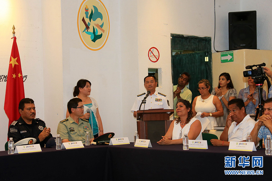 当地时间11月24日晚,编队指挥员王建勋在阿卡普尔科市政厅发表讲话。代宗锋 摄