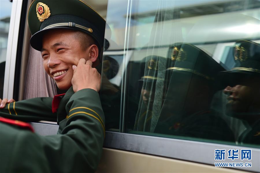 11月29日,在深圳盐田边防训练基地,一名新兵登车后与班长告别。当日,武警广东边防总队近2000多名新兵经过三个月的新兵集训并通过军政考核后,从深圳盐田边防训练基地等地出发,正式下连奔赴粤港澳边海防一线,担负缉私、缉毒等任务。新华社记者 许逆之 摄
