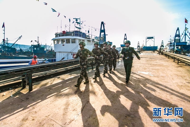 辽宁大连湾边检站官兵正在为船队出境进行巡逻保障