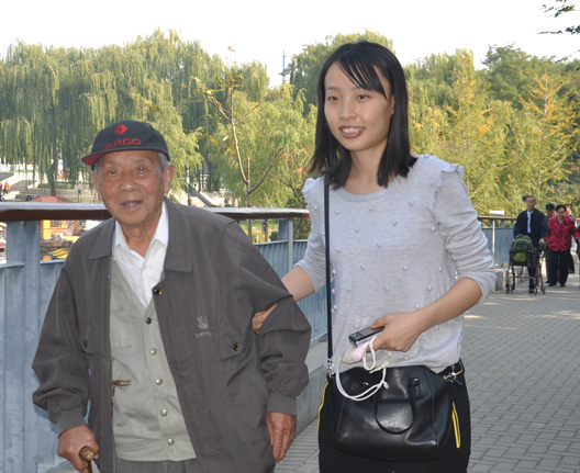 干休所工作人员正在搀扶着老干部游园。(李雪梅、高巍摄)