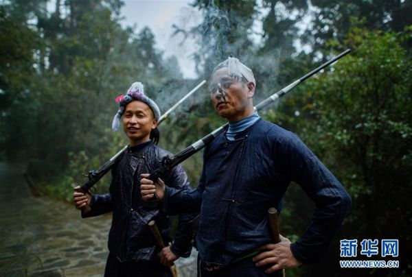 岜沙汉子肩扛火枪在寨门前欢迎远道而来的客人(11月28日摄)。岜沙苗寨坐落在贵州省从江县郊外一处海拔550米的山坳上,有300余户人家,至今保留着佩带火枪(岜沙持枪获得公安机关特别批准)、镰刀剃头、祭拜古树等古老的生活习俗。岜沙男子在头顶挽发髻,长年身佩腰刀,肩扛火药枪,宾客来临时,一身威武的岜沙男子会在寨门前吹奏芦笙、芒筒, 岜沙姑娘则用牛角杯敬上拦门米酒。一曲笙歌奏毕,三声铁铳响起,火枪对天鸣放,打开寨门迎宾入寨。岜沙苗寨被誉为“中国最后一个枪手部落”。新华社记者刘续摄