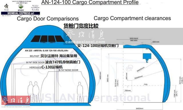 安-124主货舱尺寸为36米长×6.4米宽×4.4米高,容积1013.76立方米,载重可达150吨,起飞重量达405吨。这一指标约为美国C-17的2倍,C-5的1.25倍,安-22的1.875倍。货舱前后舱门采用液压装置开闭,分别可在7分钟和3分钟内打开。由于货舱空间很大,安-124能够运载普通飞机机身、化工厂塔件等大型货物。图中可见安-124与其他机型货舱门宽度的对比。