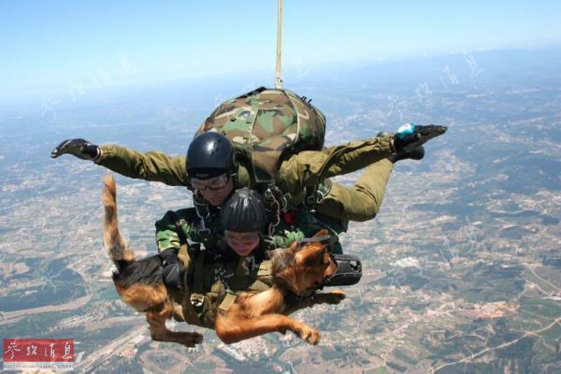参加双人跳伞训练的工作犬,这张比较少见。