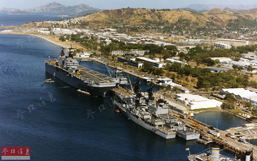 图为冷战时期,停靠在苏比克基地的美海军塔拉瓦级两栖攻击舰和护航战舰。