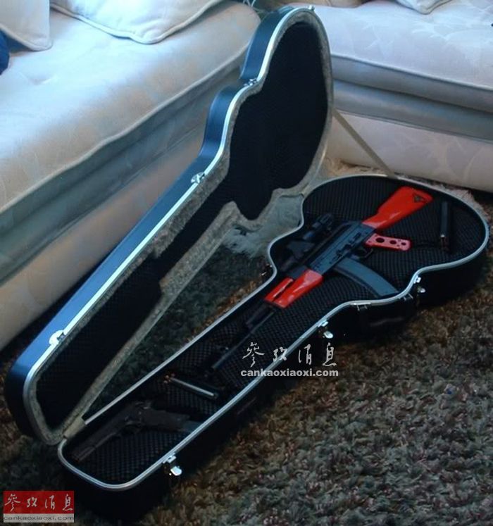 图为装入琴盒的AK-47步枪和M1911手枪。