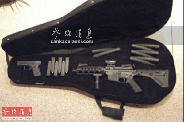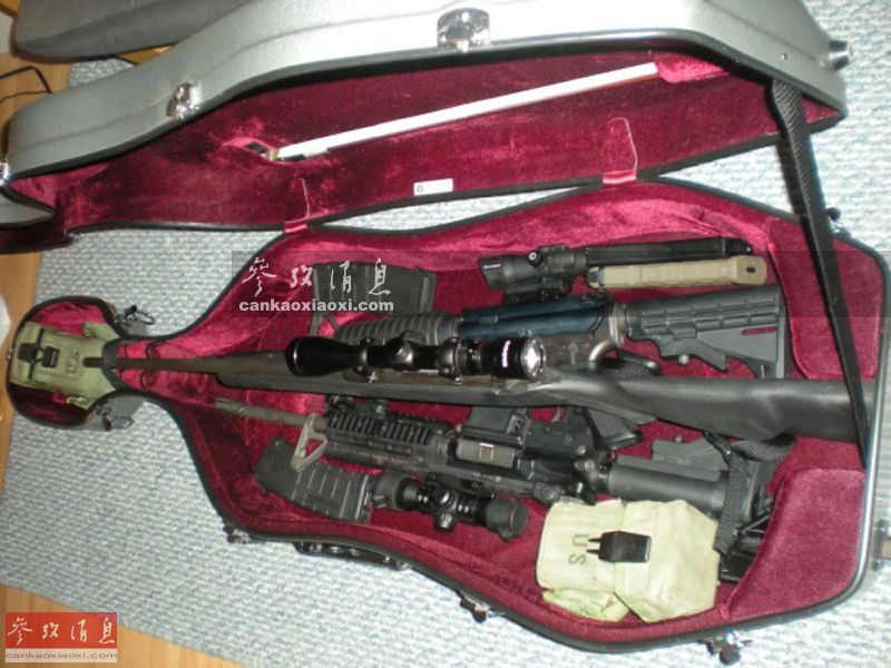 图为装入琴盒的M4卡宾枪和手枪。