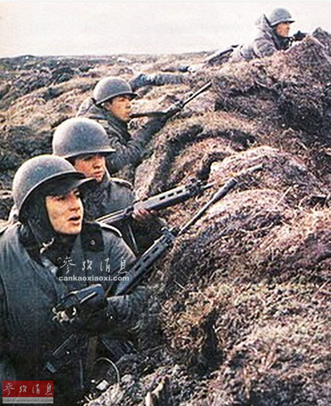 FAL自动步枪曾是西方以及许多中美洲、南美洲和非洲第三世界国家的军队广泛使用的武器。在马岛海战中,英国的登陆部队以及阿根廷的陆军和海军陆战队均使用了这一武器。图为马岛战争期间使用FAL步枪的阿根廷士兵。