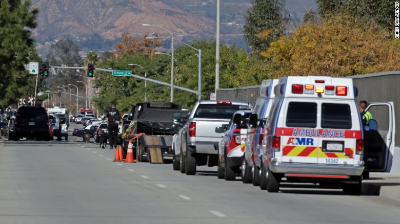 12月3日,美国加利福尼亚州的圣贝纳迪诺(San Bernardino)发生枪击,受害者多达20人,图为现场。