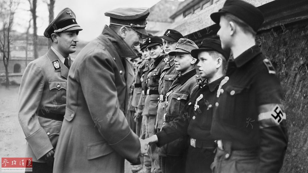 柏林与外界的所有电话联系都已中断。从现在开始,希特勒青年团的信使必须冒着生命危险多次穿过市中心的威廉街,在德军总部与地堡之间传递消息。图为1945年,希特勒接见希特勒青年团的小团员。