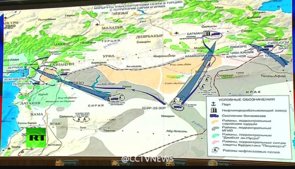 据俄军方表示,为开展非法石油贸易,“伊斯兰国”动用的运油车不少于8500辆,每昼夜最多运输石油20万桶。而最近一周,近2000名武装分子、超过120吨武器弹药和250辆各类型汽车从土耳其进入叙利亚境内。