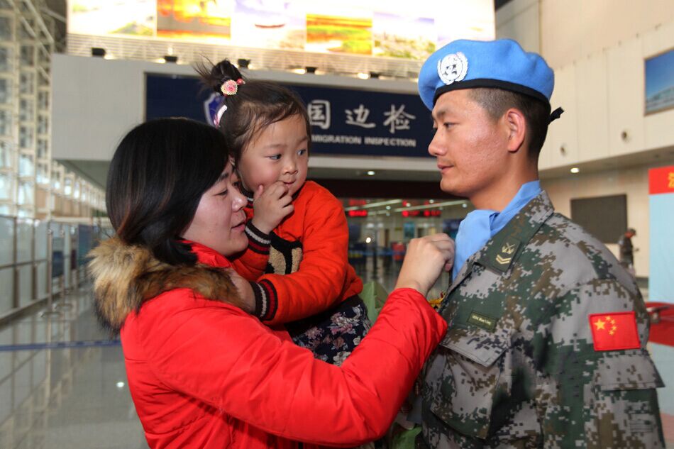 山东章丘市明水街道办宋家墨村的肖丛丛带着4岁的女儿韩筱羽,到济南机场为准备出国维和的丈夫、陆军第26集团军某工兵团军士长韩兴送行。屈指数来,这已是她第五次送丈夫踏出国门。
