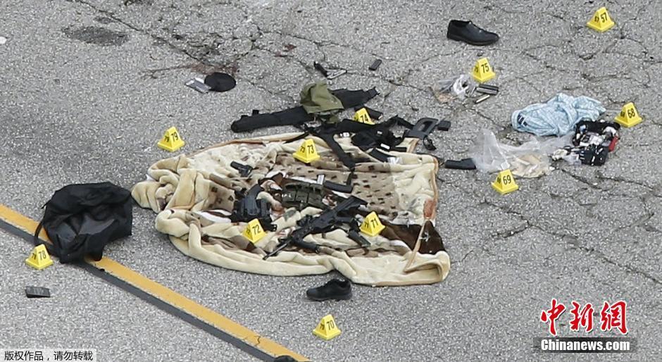 当地时间12月3日,美国加州圣伯纳迪诺市,该市2日发生枪击事件造成14人死亡。警方在枪击事件发生后与枪手发生交火,在案发现场不远处将疑犯击毙。图片显示,疑犯乘坐的越野车在交火中被打的千疮百孔,随后警方从车身内搜出大量枪支弹药。