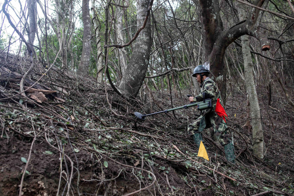 大早,友谊关口岸的宁静就被打破。等待进入货场的中越货车,排起了长队。紧邻货场的就是广西段01号雷场。这是一片三面环山的低洼地。周围山坡的坡面就是今天要搜排的地方,将近80度的陡坡,人走起来踉踉跄跄,使用机器人根本不可能。担负任务的是广西军区某部排雷队。战士杜占龙从事这项工作已有15年,是队里最有经验的搜排手之一。全套防护服穿起来有三四十斤,再穿上老式的防护靴,根本就走不了。为了行动方便,他不得不舍弃一些防护装备。图为12月3日,中越边境广西段01号雷场内,坡陡路险,搜排手艰难探雷。