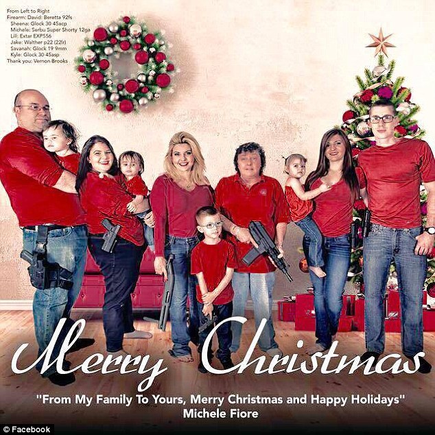 内华达州的共和党女州众议员蜜雪儿·费奥里在社交网络上贴出一张节日拥枪的全家福,也是圣诞节问候卡片。10个家庭成员除婴幼儿外,其他人全都持枪。照片中人人穿蓝色牛仔裤,上身为红色。照片下方是一段问候语:“费奥里全家向各位致意,祝大家圣诞快乐,佳节愉快!”