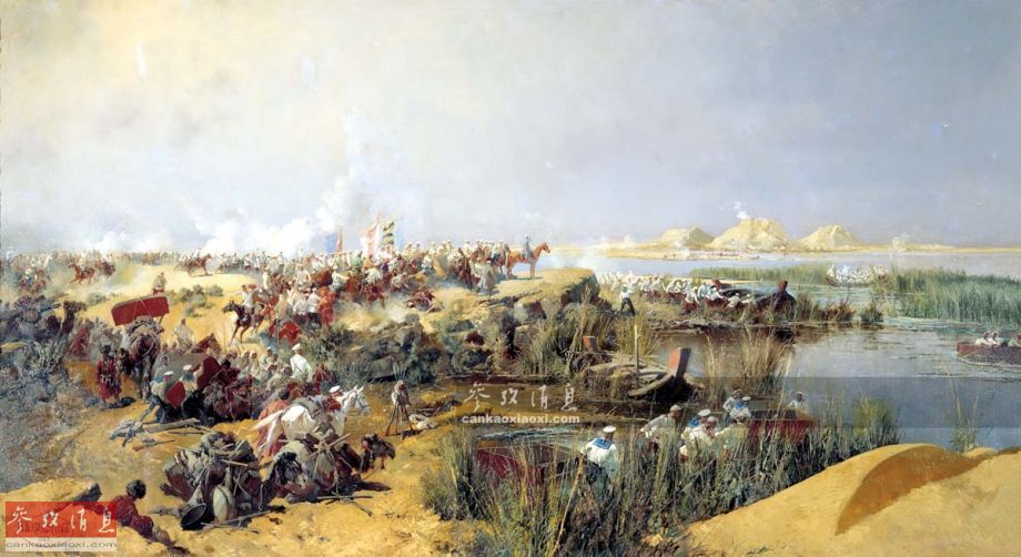 “撒马尔罕”号和“佩罗夫斯基”号明轮船与3艘纵帆船在西特尼科夫舰长的指挥下参加了远航。当年4月底,俄军舰队驶入阿姆河河口,一块芦苇密布的大河滩。图为入侵中亚的俄军在渡河。