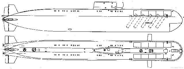 图为“帕帕”级潜艇的侧视图和俯视图。该级艇总共建造1艘,舷号曾先后为K-18、 K-162和K-222,其工程代号为 Project 661。武备方面,“帕帕”级可以携带10枚P-70反舰导弹,其作战距离为65千米。