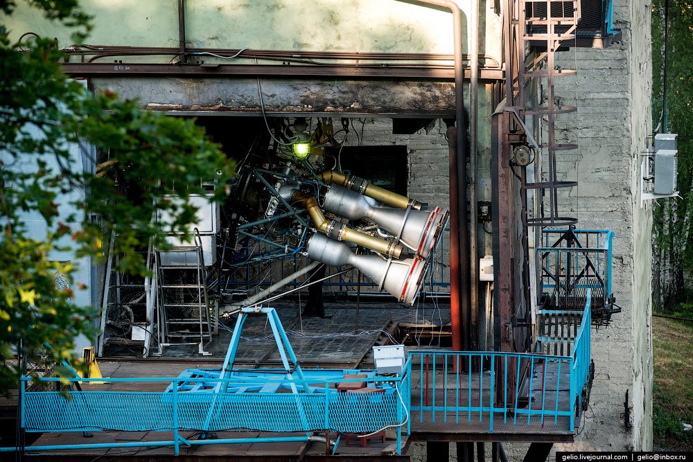 RD-107A/108A火箭发动机测试,这是在点火前几分钟拍的。确认发动机可靠性只有一个办法,就是直接用成品进行测试。发动机被固定在一个特制倾斜台架上,准备点火。