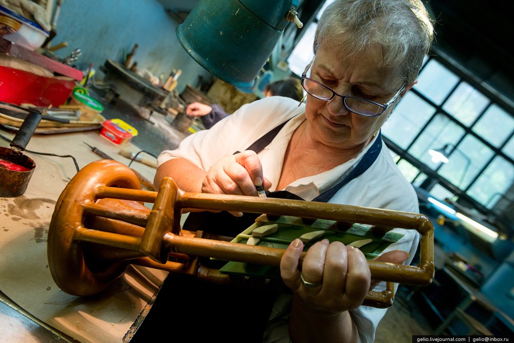 冶金车间。这里能制造工业燃气涡轮发动机和航空发动机的机匣组件,直径可达1600毫米、重量可达1500公斤。图中的女工正在组装叶片的蜡模,他们用失蜡法进行铸造。