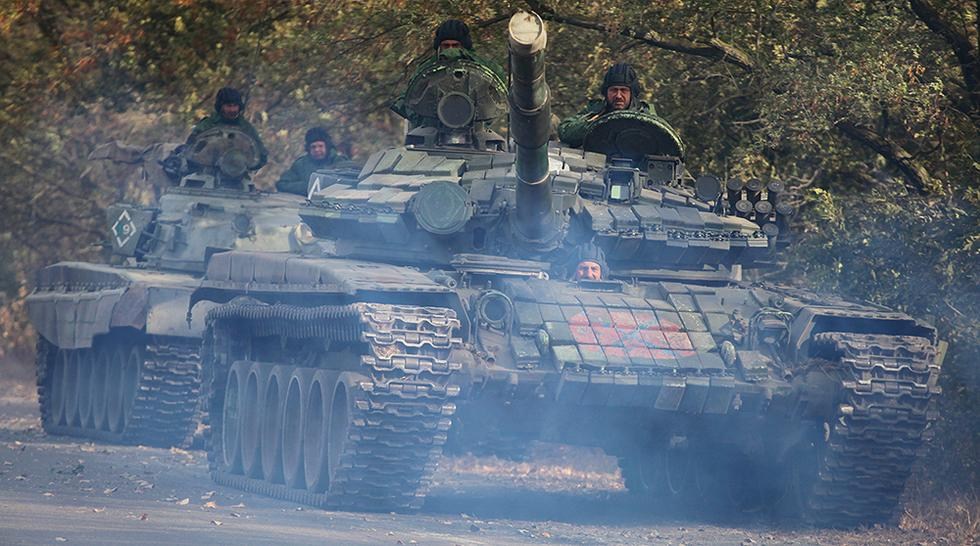 2015年10月,顿涅茨克地区,顿涅茨克民兵正在进行T-72坦克作战科目的训练。