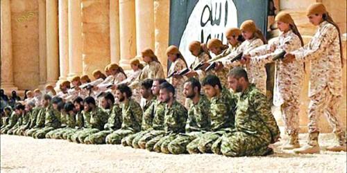 7月4日,25名叙利亚政府军士兵在罗马式圆形剧场中跪成一排,由少年执行枪决。