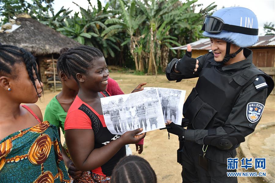 在利比里亚格林维尔一座村庄,中国维和警察防暴队队员与当地村民交流(2015年11月3日摄)。新华社记者孙瑞博摄
