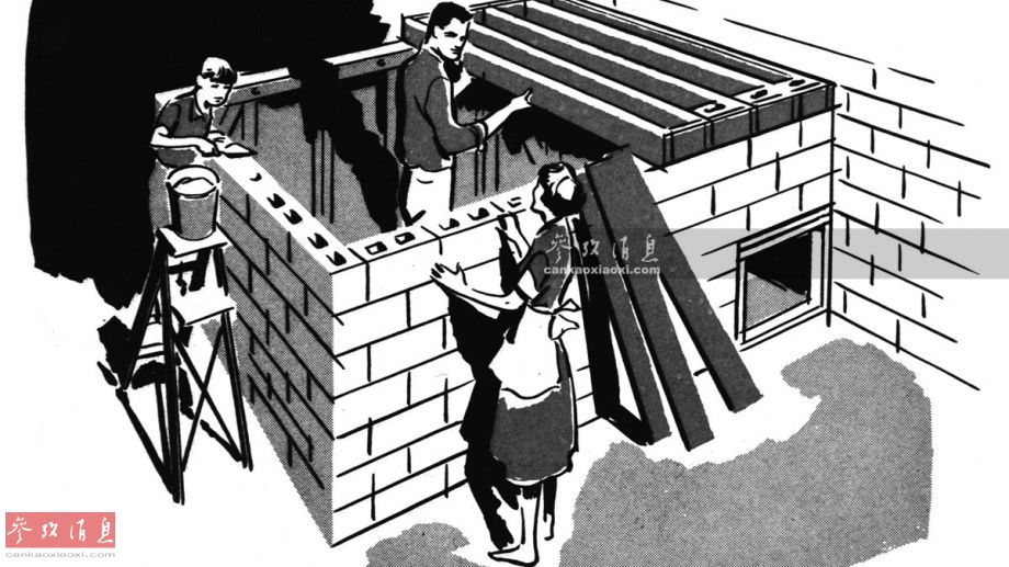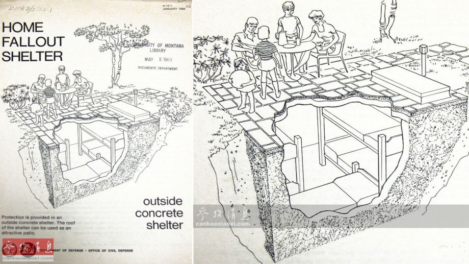 1961年五角大楼出版的宣传品上介绍了一种家用防辐射落尘掩体的建造方法,即使用中空的混凝土搭建掩体,然后用沙子填充缝隙。