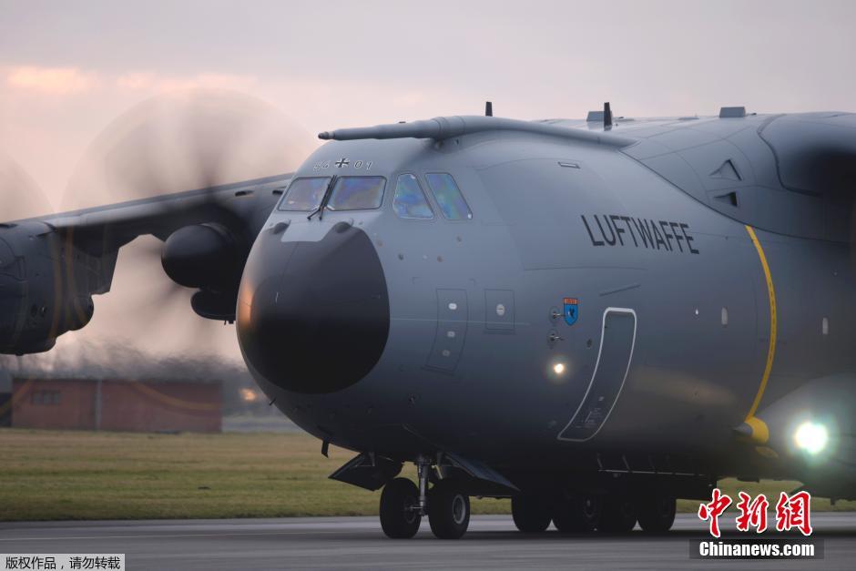 当地时间12月10日,一架德国空军的空客A400M运输机载着派往叙利亚的先遣部队和军事装备从空军基地起飞。