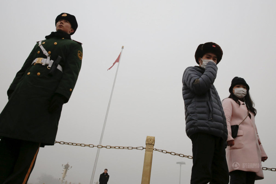 北京雾霾红色预警 天安门武警首次戴口罩执勤
