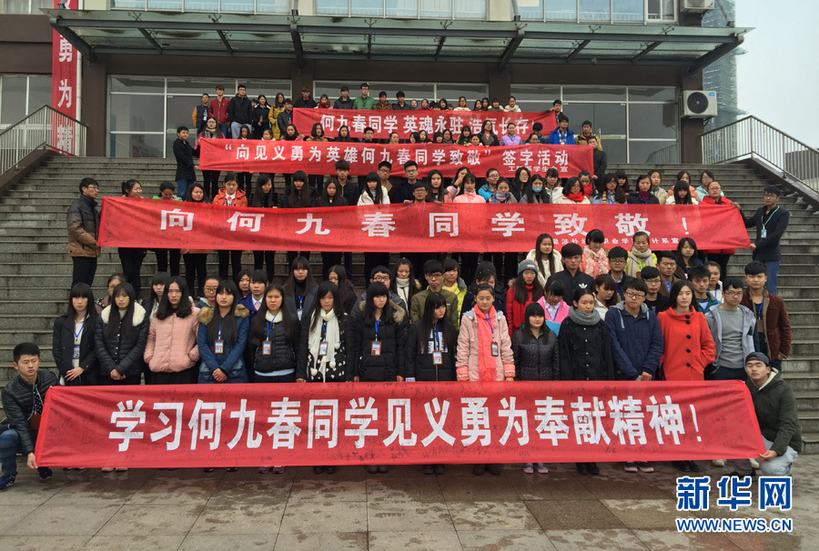 危难时刻挺身而出,英雄壮举催人泪下。何九春的同学们纷纷自发的打出标语,向何九春致敬。