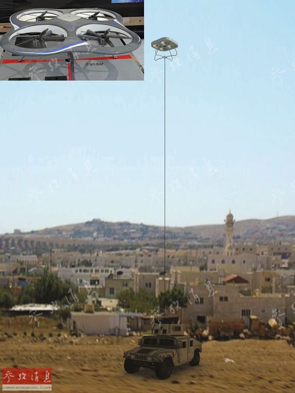 除单兵无人机外,IAI还于2012年推出了名为“电动系绳观测平台”( ETOP)的系留式四旋翼无人机,由于电源可通过地面的细电绳供电,续航时间近似于无限,其最大飞行高度3000米,可携带20千克载荷,十分适用于执行基地守卫或边境监视任务。