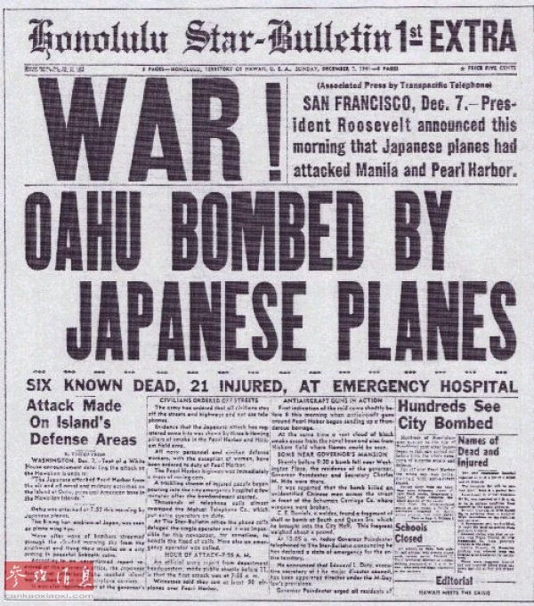 图为1941年12月7日,夏威夷《檀香山星报》有关珍珠港遭偷袭的头版报道,“战争!瓦胡岛遭日本战机轰炸”。