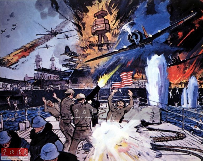 《虎虎虎》电影宣传海报,视角转为遭袭的美军战舰甲板上,少数美军舰员正在使用防空机枪对俯冲攻击的日机进行射击,日军偷袭部队当天仅损失了26架战机。