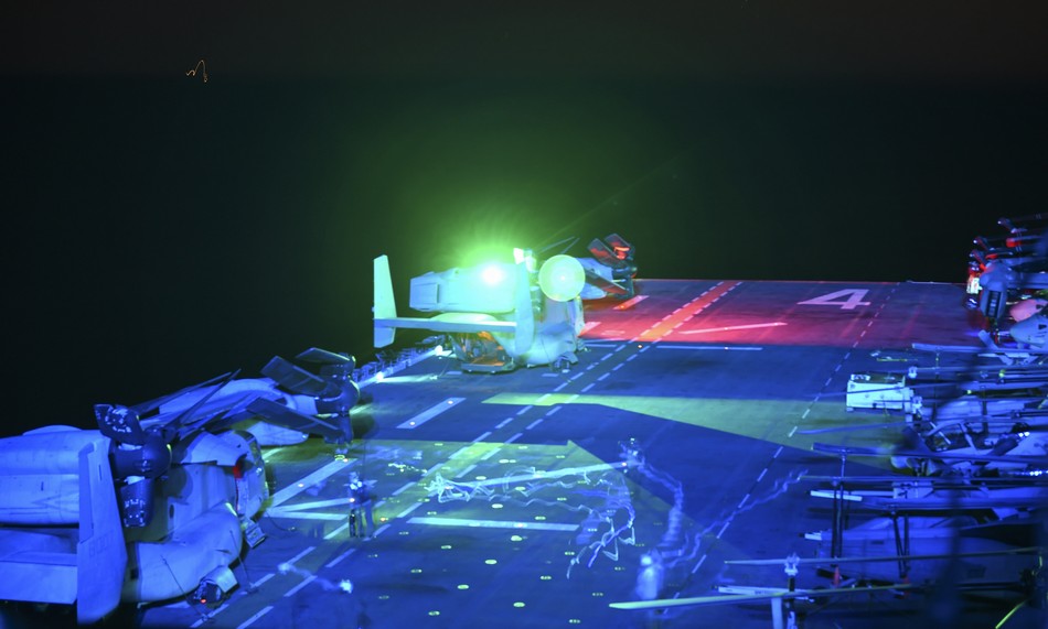 12月12日,正在太平洋上执行巡航任务的美国海军“拳师”号两栖攻击舰进行了舰载机夜间起降训练,夜幕下的军舰光影交错,画面科幻。