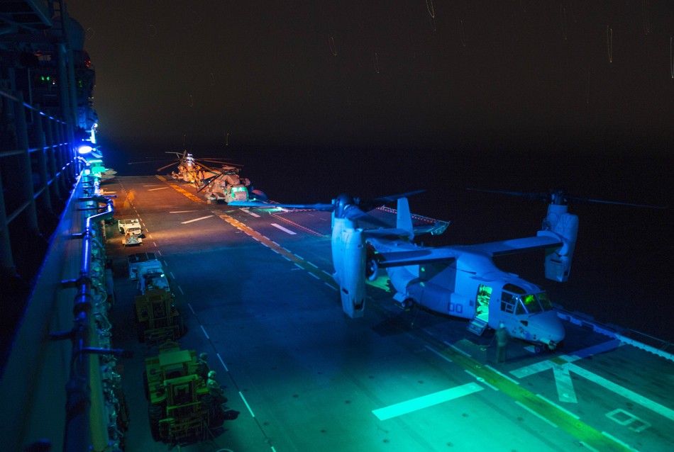 12月12日,正在太平洋上执行巡航任务的美国海军“拳师”号两栖攻击舰进行了舰载机夜间起降训练,夜幕下的军舰光影交错,画面科幻。