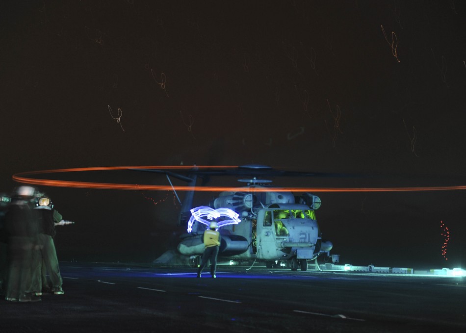 12月12日,正在太平洋上执行巡航任务的美国海军“拳师”号两栖攻击舰进行了舰载机夜间起降训练,夜幕下的军舰光影交错,画面科幻。