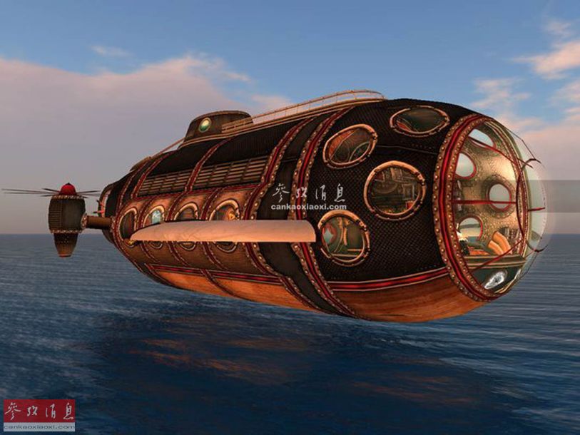 蒸汽朋克风格的旅游观光飞行潜艇CG图。