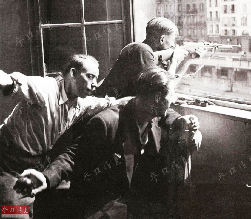 在诺曼底和普罗旺斯登陆之后,法国抵抗运动被正式组织为法国内务部队。1944年法国内务部队的人数有近100,000人,在此后得到快速的增长,次月数量便翻番,在同年10月便达到400000人。图为1944年8月的巴黎,法国抵抗组织正在战斗。