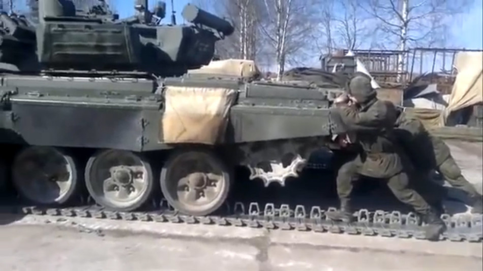 这段俄罗斯坦克兵为疑T-72B3主战坦克更换履带的视频堪称标准的“一分钟物理小课堂”。十来个坦克兵拼尽全力推动坦克,40吨的铁疙瘩徐徐前进;坦克脱离旧履带后,一众坦克兵立即转为“拔河模式”,又费了九牛二虎之力才让坦克停稳。