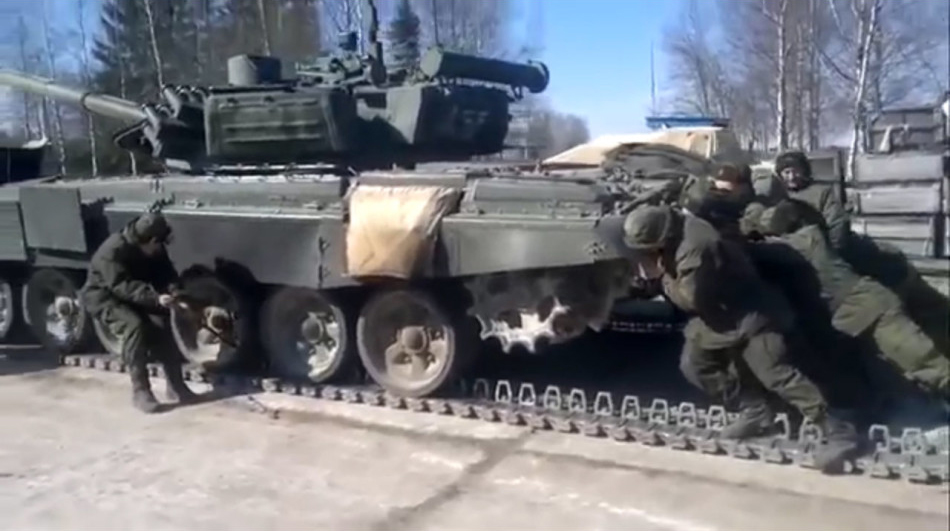 这段俄罗斯坦克兵为疑T-72B3主战坦克更换履带的视频堪称标准的“一分钟物理小课堂”。十来个坦克兵拼尽全力推动坦克,40吨的铁疙瘩徐徐前进;坦克脱离旧履带后,一众坦克兵立即转为“拔河模式”,又费了九牛二虎之力才让坦克停稳。