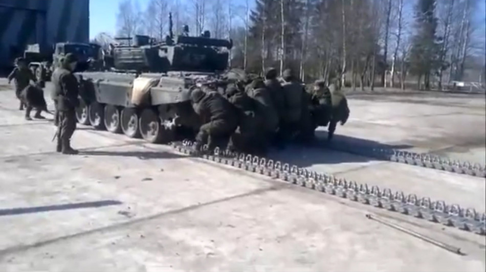 这段俄罗斯坦克兵为疑T-72B3主战坦克更换履带的视频堪称标准的“一分钟物理小课堂”。十来个坦克兵拼尽全力推动坦克,40吨的铁疙瘩徐徐前进;坦克脱离旧履带后,一众坦克兵立即转为“拔河模式”,又费了九牛二虎之力才让坦克停稳。