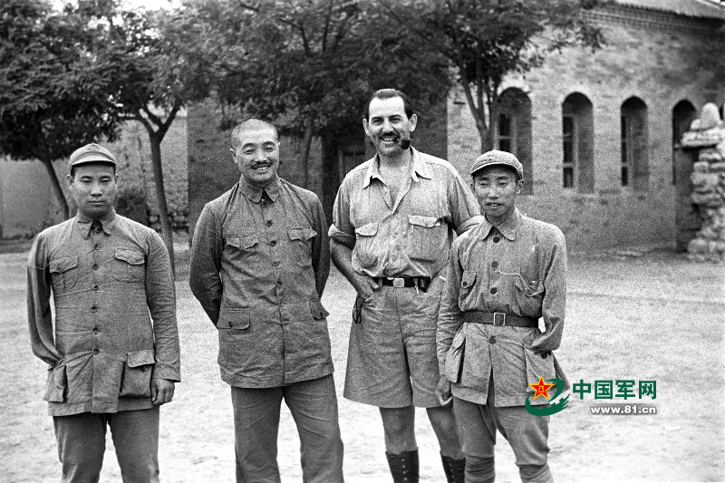 1937年7月7日,美国记者哈里森·福尔曼在陕西富平县庄里镇红二方面军总指挥部,采访总指挥贺龙(左二)、6师师长贺炳炎(左一)、教导团团长彭绍辉(右一)