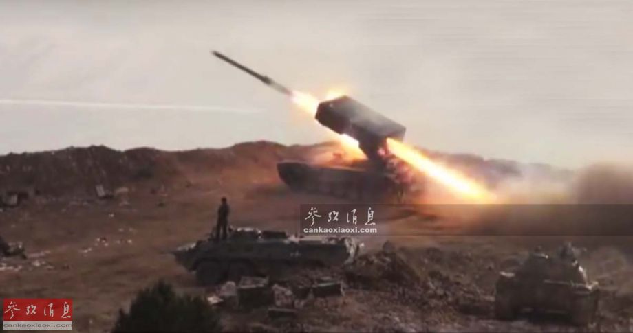 另据叙利亚官员透露,俄罗斯已“承诺将驻叙军机数量增至100架以上,以满足地面部队的需求”。此外,俄军还向叙利亚战场运送了大量火箭炮和TOS-1喷火坦克,这些大杀器能有效摧毁敌军防御工事,属于典型的进攻支援火力。图为TOS-1喷火坦克。