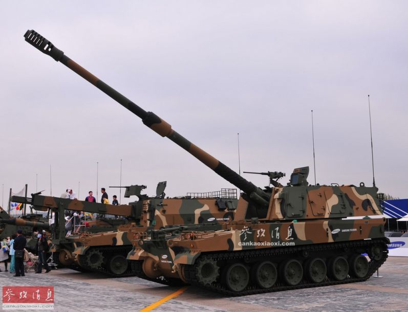 K-9自行火炮由韩国三星集团研发,在历经9年(1989-1998)的技术攻关后,终于在1999年投入韩军服役。K-9是是亚洲第一款采用52倍径长身管的155毫米自行火炮,此前只有德国的Pzh-2000自行火炮采用了相同倍径。图为静态展示的K-9自行火炮。