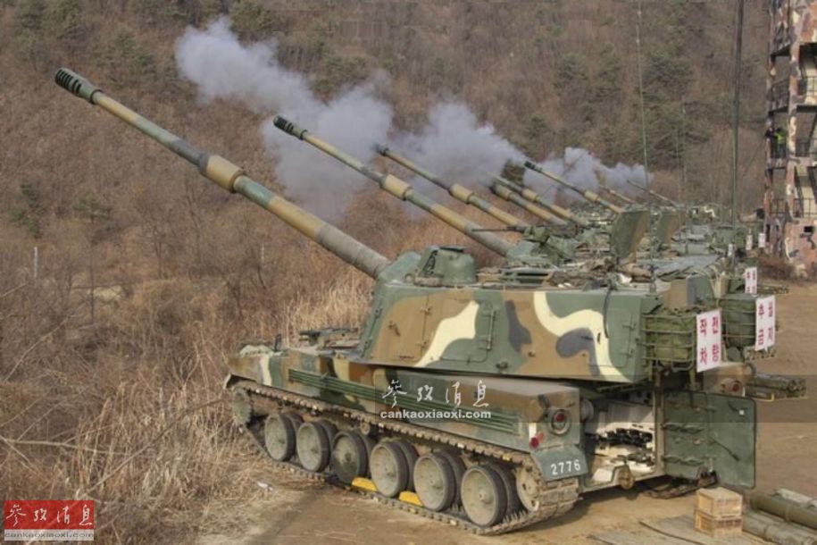 图为韩陆军K-9自行火炮群在山间进行齐射打靶。