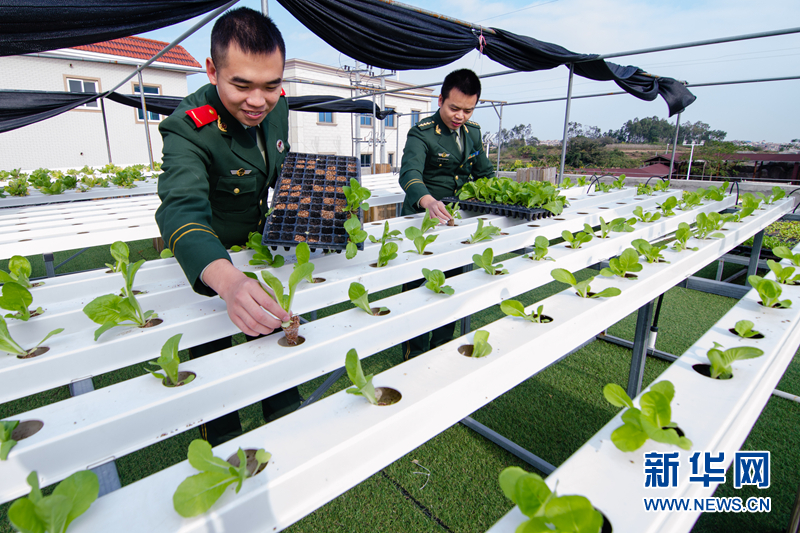 近日,在福建泉州边防支队东岭边防派出所无土栽培的“空中菜园”里,官兵们忙着开展冬季育苗工作。