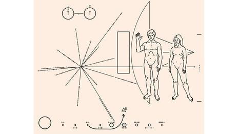 美国宇航局“先驱者”号太空探测器携带的信息,包括一些符号和图形以及展示一名裸体男性和一名裸体女性的图画。不过,这些信息可能是外星人无法理解的,就像我们无法理解石器时代的岩刻画一样.