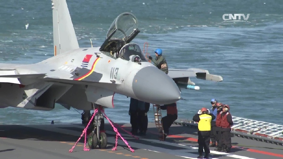 日前,海军辽宁舰在渤海某海域进行舰机融合训练,新一批歼-15舰载战斗机飞行员驾机完成触舰复飞、阻拦着舰等多个课目训练。中央军委委员、海军司令员吴胜利,海军政委苗华率海军党委班子成员在辽宁舰参训并指导舰机融合训练。