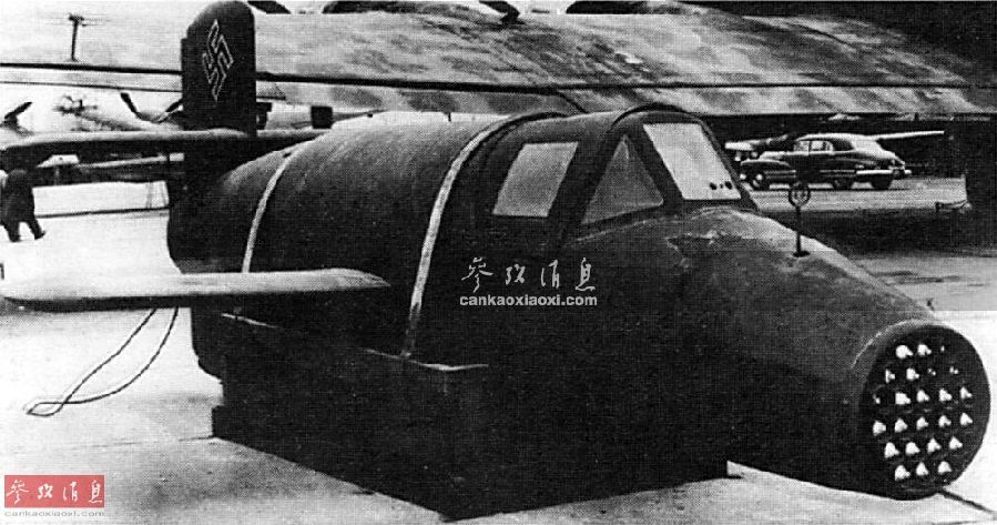实际“尾坐式起降”方式并非美国首创,而是出自二战纳粹德国。二战后期,由于纳粹德国空军逐渐失去制空权,机场经常遭到盟军战机轰炸,德军迫切需要一种不依靠机场就能起飞的战机来截击盟军轰炸机群。BA-349“蝮蛇”火箭截击机应运而生,这种战机首次部分采用了尾坐式起飞方式,只是动力采用的是火箭助推器,而且是一次性的。 图为BA-349火箭截击机,可见机头的24联装73毫米火箭巢。