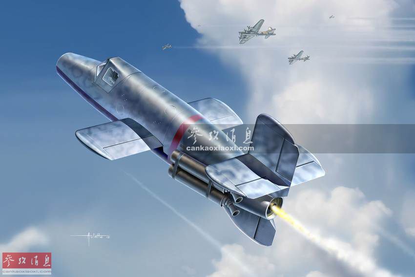 图为艺术家绘制的Ba-349升空拦截盟军轰炸机想象图。