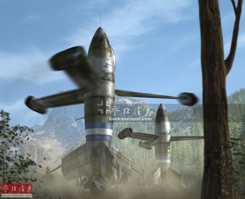 除了BA-349“蝮蛇”外,纳粹德国在二战末期还研发过一种“动力机翼垂直起降战斗机”(Triebflugel),动力改用3台冲压喷气发动机,直接推动三片机翼旋转起飞,但由于设计过于超前,到德军战败投降前,该机只完成了风洞模型测试,都未制造原型机。图为动力翼战机垂直起飞想象图。
